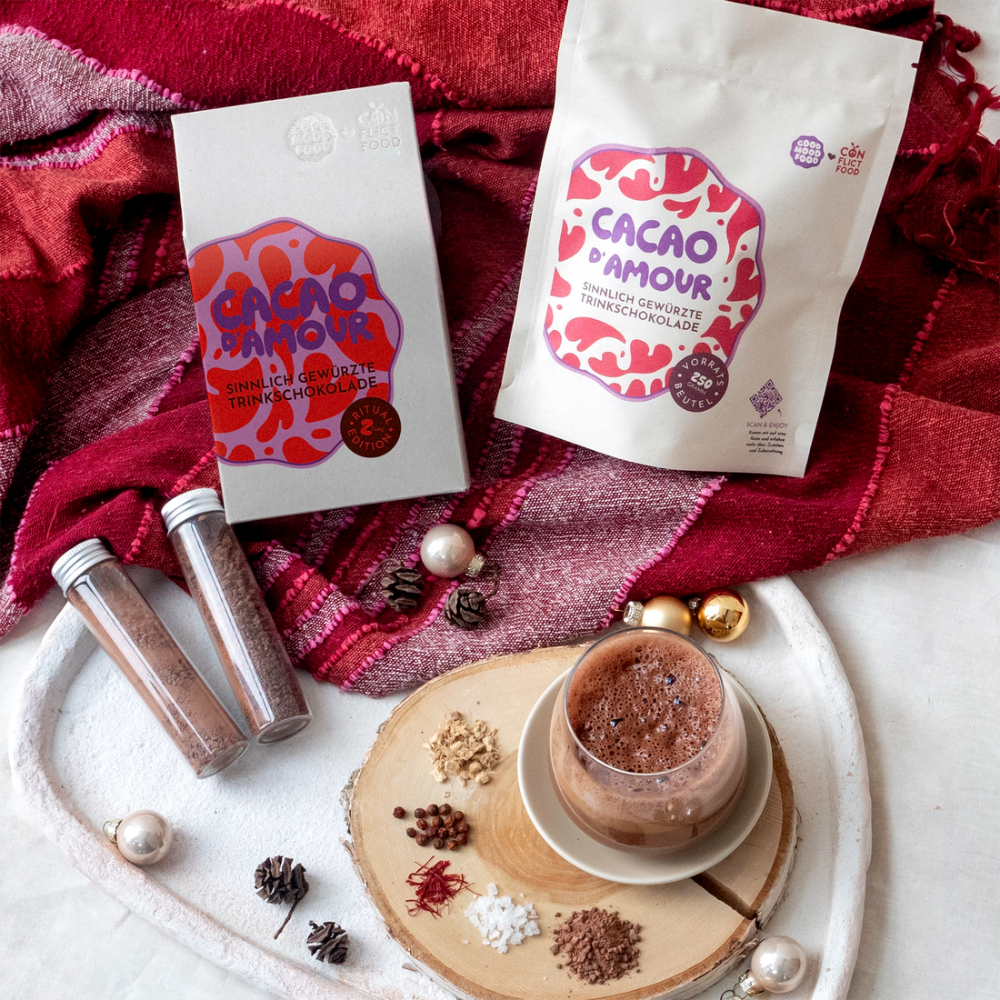 Conflictfood & Goodmoodfood – zwei befreundete Berliner Marken, eine gemeinsame Vision. Statt Konkurrenz setzen wir auf Kooperation und haben unser Wissen, unsere Lieblingszutaten und unsere Leidenschaft vereint, um etwas Besonderes zu schaffen: Cacao d’Amour. Dieser Kakao steht für Genuss mit Sinn – und das schmeckt man mit jedem Schluck! Tipp: Genieße Cacao d’Amour mit deinem Lieblingsmenschen. Besonders die Ritual Edition für zwei Personen lädt dazu ein, Momente des Miteinanders zu zelebrieren. Mit dabei: das Poster „Love, Peace & Unity“ – eine kleine Erinnerung an das, was wirklich zählt.