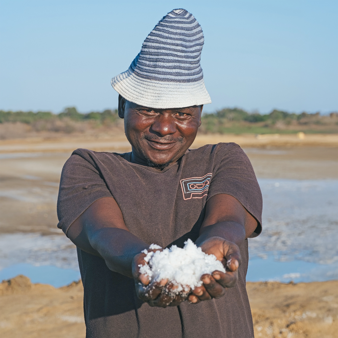 Hafiz senior: Es gibt vier Sorten: Das Salz der einfachsten Qualität ist braun und für uns ungenießbar. Es wird als Tierfutter genutzt. Die dritte Qualitätsstufe ist billiges, braunes Salz, Stufe zwei geht als weißes Meersalz in den Verkauf. Die höchste Qualitätsstufe ist das weiße Flor de Sal. Es ist herrlich mild und hat eine viel feinere Konsistenz als Meersalz. Flor de Sal von der Ilha de Moçambique hat einen ganz speziellen Geschmack – es ist ganz besonders weich und zart. Wenn du mich fragst, liegt das an der Unberührtheit der Insel und der Küste. Keine Häfen, keine Verschmutzung – nur frisches, kristallklares Wasser aus dem Indischen Ozean. Für mich ist es das beste Salz der Welt!