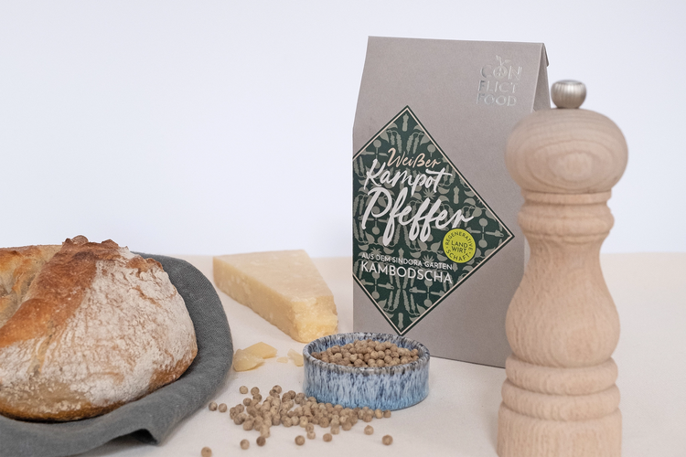 Eine dieser Traditionen ist der Anbau des legendären Kampot-Pfeffers. In der Küstenregion Kampot wird dieser nach alten Methoden kultiviert – als einzige Pfeffersorte mit geschützter Herkunftsbezeichnung. Er steht für Qualität, Handarbeit und nachhaltige Landwirtschaft. Conflictfood handelt direkt mit den Bäuerinnen und Bauern vor Ort und schafft so faire wirtschaftliche Perspektiven – in einem Land, das immer wieder beweist, dass es Hoffnung und Wandel in sich trägt.